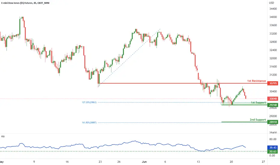 On the H4, with price expected to bounce off the stochastics indicator, we have a bullish bias that price will rise from our 1st support at 29748 where the 127.2% Fibonacci extension is to our 1st resistance at 30795 in line with the horizontal pullback support. Alternatively, price may break structure and head for 2nd support where the 161.8% Fibonacci extension is.