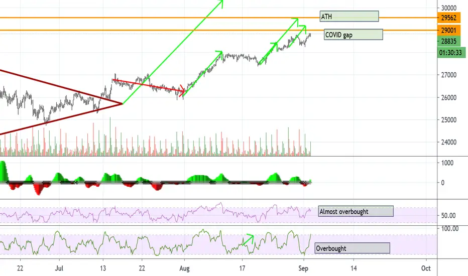 Looks to me like it's going to fill the COVID gap then drop. MFI already overbought, RSI almost there.