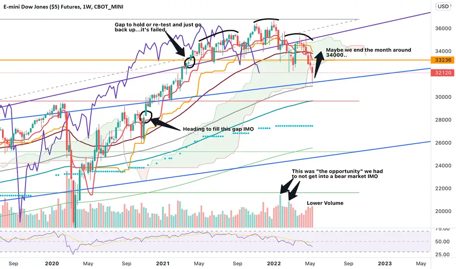 I was a bullish hopeful at the start of the week...I was thinking we would fill the 4K gap on the ES and then just go. Instead we spent 4 days closing below this figure. Yes, we closed the week above it and kept the lagging span just above the cloud but we cannot go anywhere with the DOW and this chart says it all. Neckline is clearly broken. Now, I do think we could have a minor rally to end May with a possible green monthly candle.