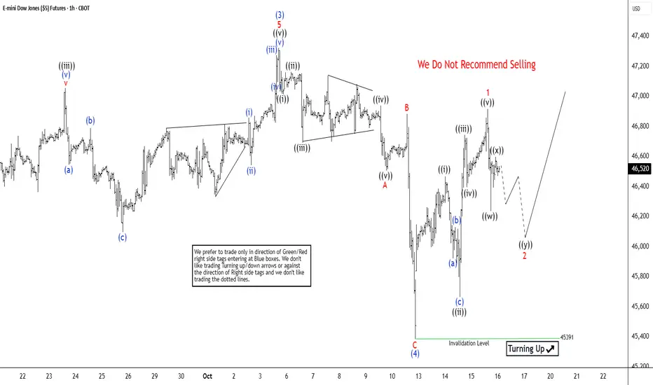 The short-term Elliott Wave outlook for Dow Futures (YM) indicates that the cycle from the April 2025 low continues as a five-wave impulse. As shown in the 1-hour chart, wave (3) of this impulse peaked at 47,323. The subsequent wave (4) pullback unfolded as a zigzag Elliott Wave structure. From wave (3), wave ((i)) declined to 47,014, followed by a wave ((ii)) rally to 47,162. Wave ((iii)) dropped to 46,693, wave ((iv)) rose to 46,938, and wave ((v)) concluded at 46,507, completing wave A. Wave B bounced to 46,883, and wave C extended lower to 45,391, finalizing wave (4) in the higher degree.