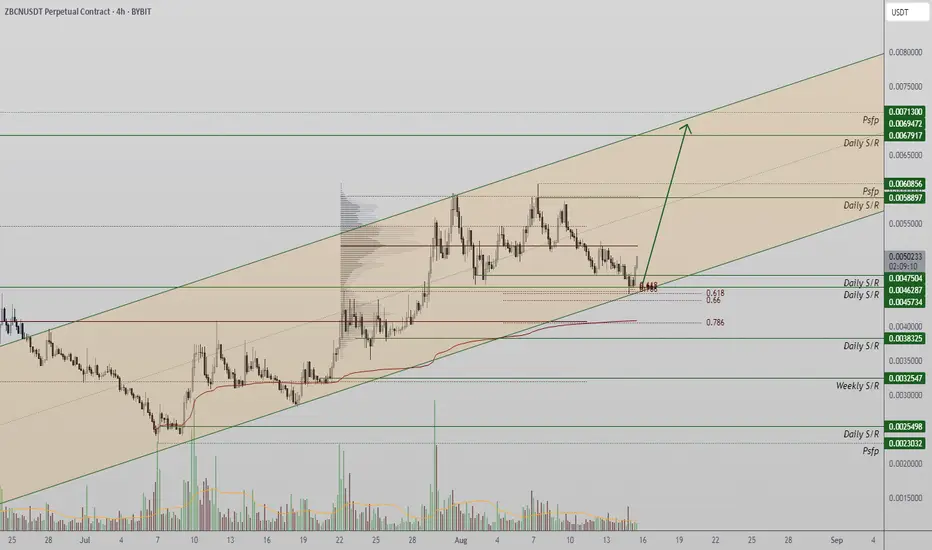 Price action on ZBCN has respected the ascending channel’s lower boundary, with recent tests confirming demand at the 0.618 Fibonacci retracement. This level acts as a crucial pivot for maintaining the current bullish market structure.