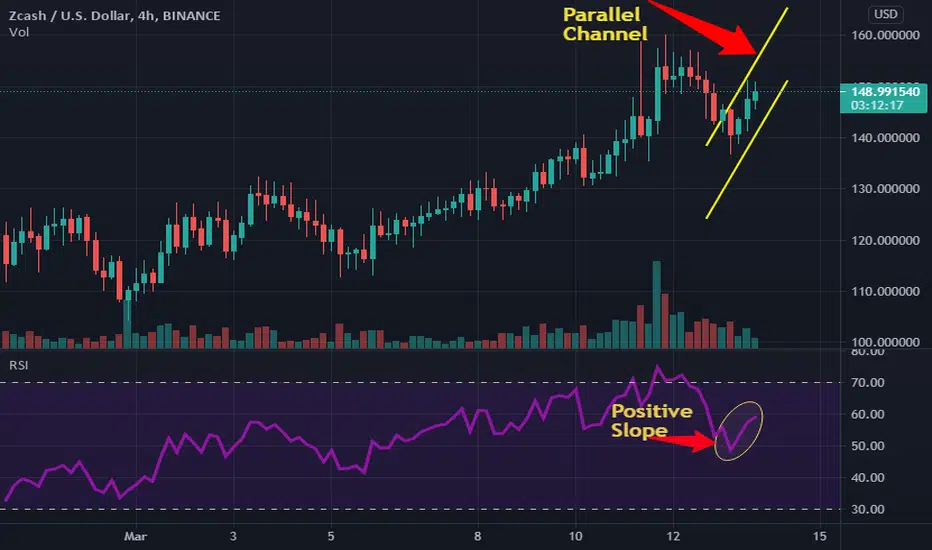 .The daily chart of ZEC hints at the start of a bullish move. On coming to the shorter time frame of 4 hours, the coin has formed a upward parallel channel. If the price breaks above 5% of the current position, it can see a rally upto $200 in upcoming trading sessions.ZEC price can also see a new low if it comes below the channel.