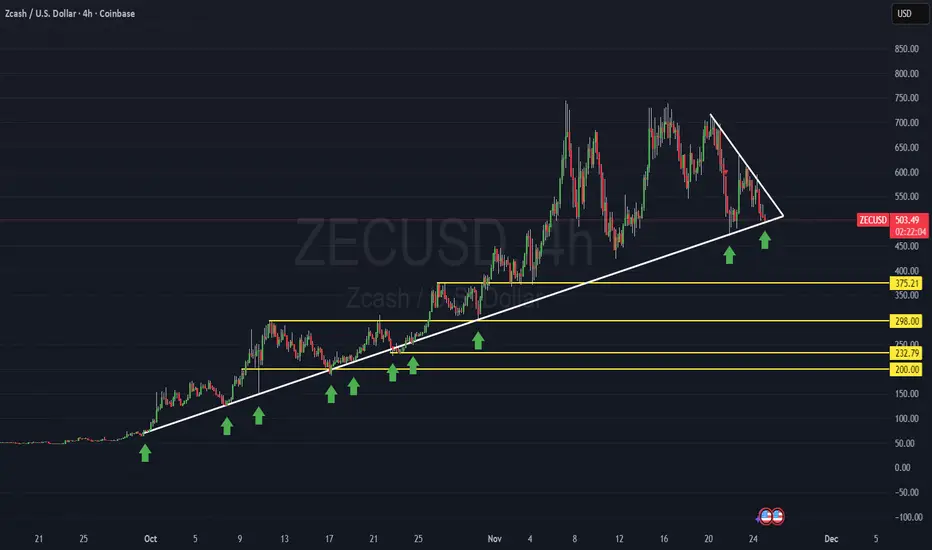 I will keep this 4H chart explanation simple. Notice the upsloping trend line in white. Price has just made the tenth (10) hit on it and has acted as support thus far. The support hits on the trend line are marked by the green up arrows. How many times can price hit and bounce up off of this support line? Price is at about a 85-90% chance of breaking below the trend line. We need a confirmed close below the trend line for the price to really dump down to the minor support lines in yellow. These will be temporary stops and reversals on the trip down. Not looking good for ZEC. Very bearish. Plus, there is still negative RSI divergence.