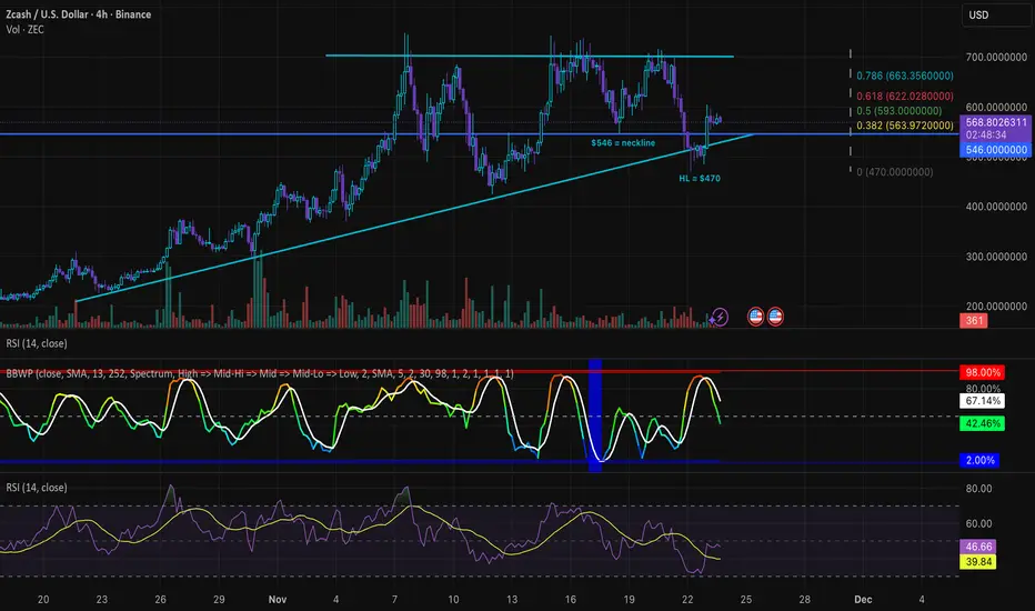 ZEC will likely consolidate in the current zone until BBWP resets to the blue zone before attempting a directional move within the triangle. $560 seems like a good entry for short-term trades with targets near $580–$600 lower-timeframe resistances.