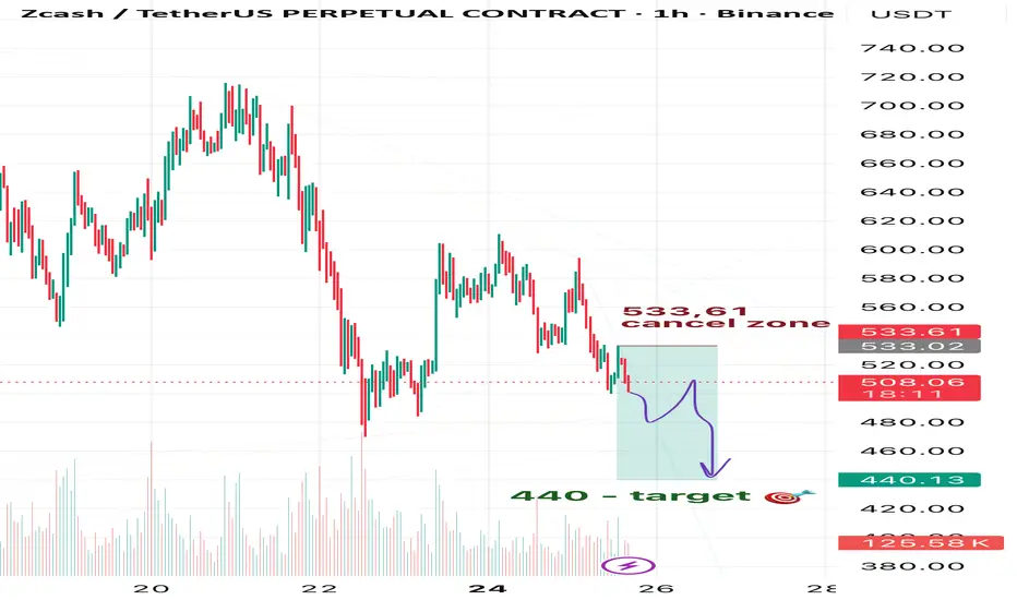 Yesterday, ZEC broke through my scenario invalidation zone. Earlier, I shared an idea expecting ZEC to move toward 480 and lower. Despite this breakout, the broader bearish setup is not invalidated — in fact, ZEC has only confirmed its intention to continue downward 📉