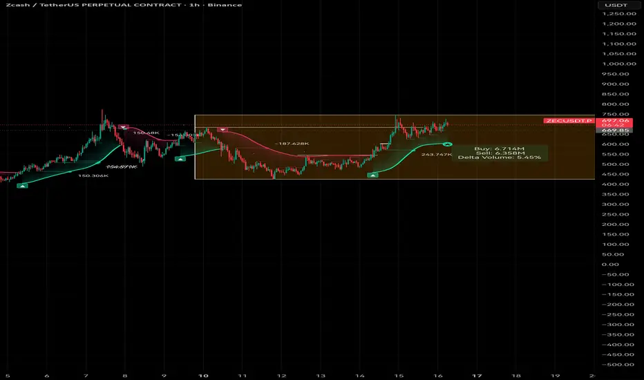 The chart shows ZECUSDT trading inside a clearly marked weekly candle range highlighted by the large box. Price has spent an extended period consolidating within this zone after a major drop, and the recent move indicates buyers are gradually gaining strength, supported by a positive delta volume reading. The market is currently pushing toward the upper boundary of the weekly range, showing signs of an emerging short-term bullish structure. As long as price remains above the mid-range of the box, the bias stays positive. A logical take-profit level sits near the upper range resistance around 740–760, where previous reactions occurred. A reasonable stop-loss would be below the lower boundary of the weekly box near 540–560, which marks the key support that defended the market during the consolidation. If the breakout holds above the weekly range, the next trend is likely to continue upward with momentum, but rejection at the top would pull the market back into sideways consolidation.