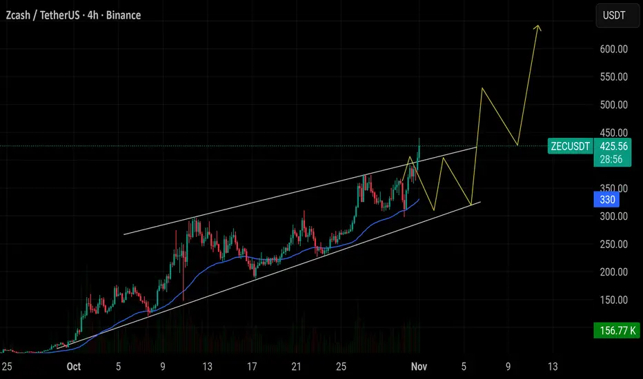 ZZEC/USDT successfully retested the $308 zone at the 50 EMA and bounced strongly upward. The breakout above $400 confirms a clear bullish continuation pattern. With the retest already completed, momentum now favors further upside. As long as the price holds above $400, ZEC remains in a strong uptrend. The next target zone is between $500 and $600.