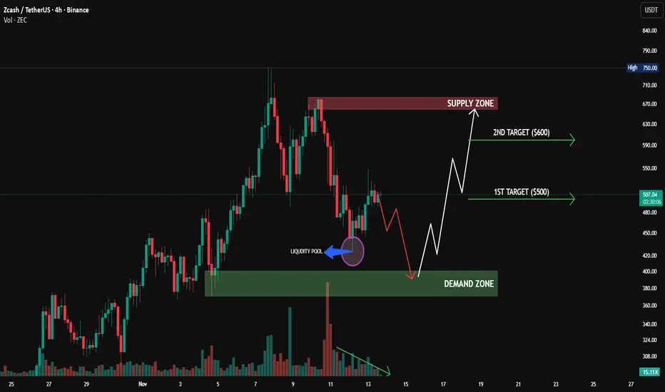 ZEC has formed a liquidity pool below key lows with declining volume, hinting at a potential liquidity grab before reversal. A successful tap into the $400–$370 demand zone could trigger a move toward $500 and $600 respectively. Holding above demand keeps the bullish recovery setup intact.