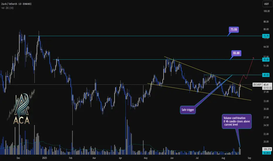 ZEC is coiling within a symmetrical triangle, setting the stage for potential breakout action. Bulls are watching $45.50 for a clean breakout trigger, eyeing $55 and $73.55 as next targets. Always wait for strong volume and confirmed closes before acting—symmetrical triangles can break both ways if conviction is lacking.