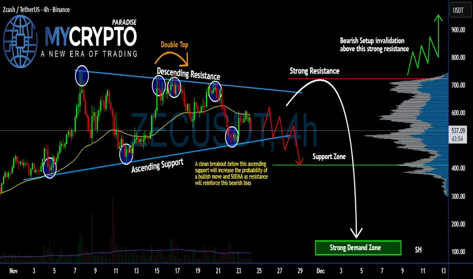💎#ZEC has been trading between a clean symmetrical triangle, creating a tightening structure. This squeeze has already produced multiple strong rejections from the descending trendline, including a clear Double Top, which only strengthens the bearish narrative.