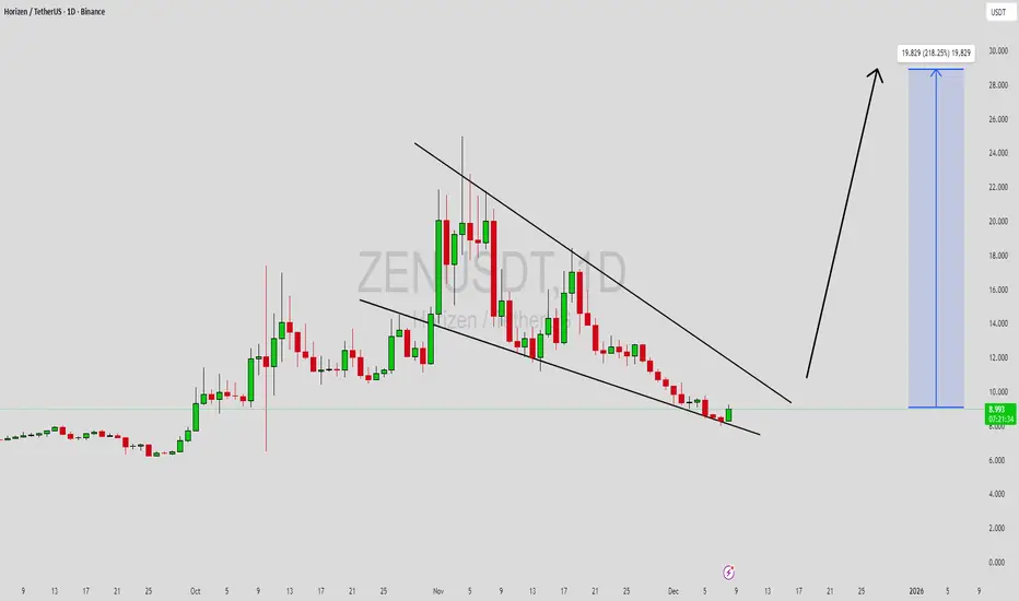 ZENUSDT is forming a clear falling wedge pattern, a classic bullish reversal signal that often indicates an upcoming breakout. The price has been consolidating within a narrowing range, suggesting that selling pressure is weakening while buyers are beginning to regain control. With consistent volume confirming accumulation at lower levels, the setup hints at a potential bullish breakout soon. The projected move could lead to an impressive gain of around 190% to 200% once the price breaks above the wedge resistance.
