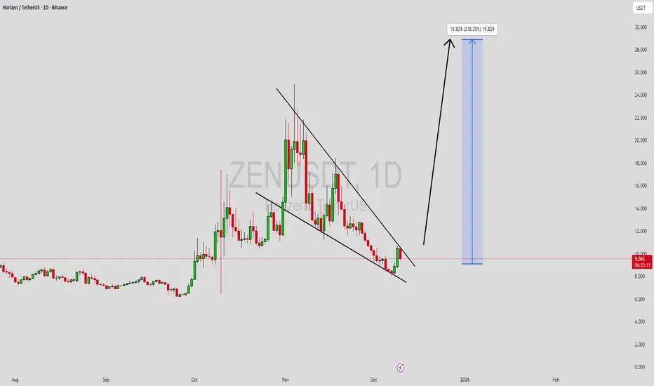 ZENUSDT is forming a clear falling wedge pattern, a classic bullish reversal signal that often indicates an upcoming breakout. The price has been consolidating within a narrowing range, suggesting that selling pressure is weakening while buyers are beginning to regain control. With consistent volume confirming accumulation at lower levels, the setup hints at a potential bullish breakout soon. The projected move could lead to an impressive gain of around 190% to 200% once the price breaks above the wedge resistance.