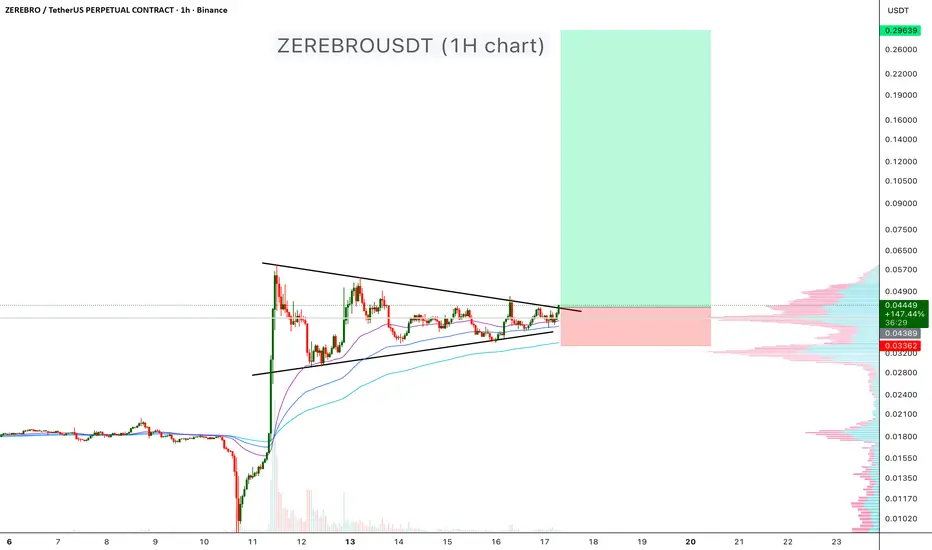 ZEREBRO is currently consolidating inside a symmetrical triangle pattern on the 1-hour timeframe after a massive impulsive move to the upside. The price has been forming higher lows while facing consistent resistance from the descending trendline, showing clear compression in volatility — a typical sign of an upcoming breakout.