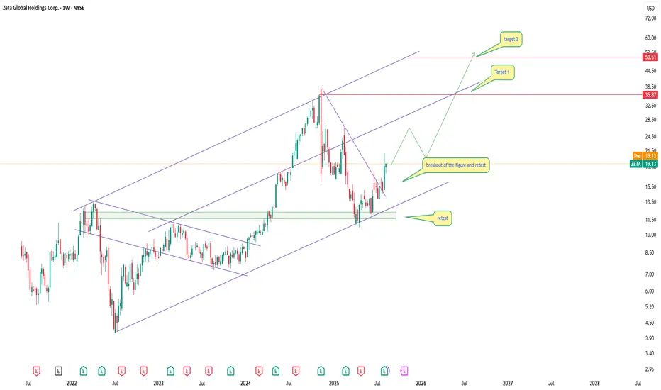 On the weekly chart, ZETA trades inside an ascending channel. After a deep pullback to the lower channel boundary (14–15$), the price bounced and consolidated above 19$, breaking the descending trendline. The nearest resistance is at 35.87$, and if broken, the next target lies at 50.51$.