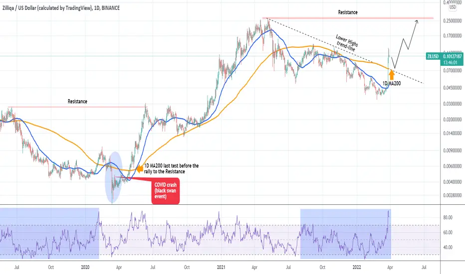 If we exclude the COVID crash of March 2020, we see a similar bullish break-out on ZIL during the last Cycle. The 1D MA200 break-out on February 03 2020 was followed by this Black Swan event and after the market stabilized, ZIL made a last 1D MA200 test before the rally towards the previous long-term Resistance. So if you missed the current break-out, it would be best to wait for a pull-back near the 1D MA200 again, unless we witness another Black Swan event, which of course don't come and go every year. Our projection is that ZILUSD can test its 0.2600 - 0.2700 Resistance Zone by the end of June.