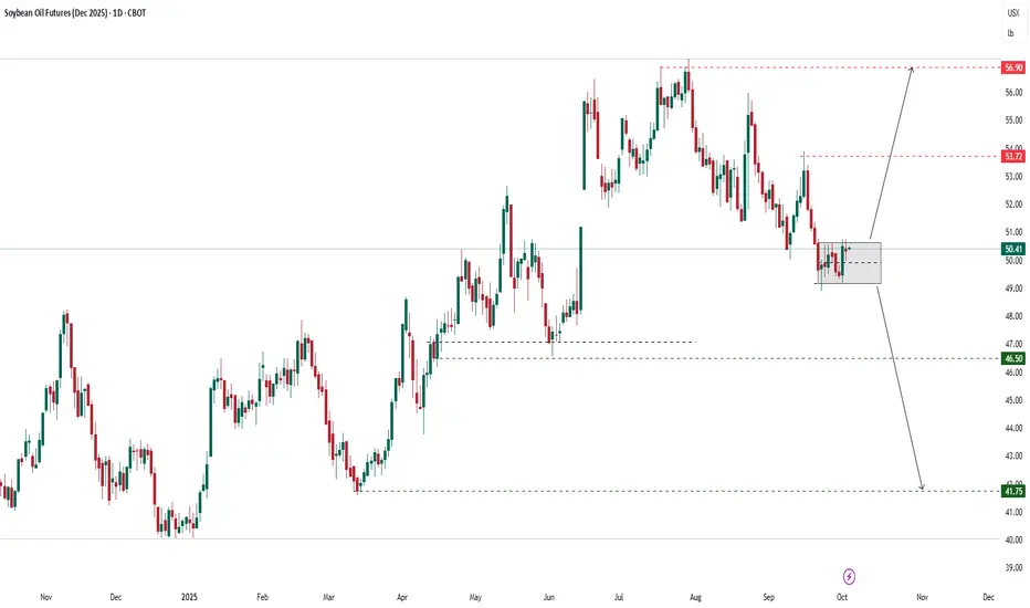 Soybean oil (Dec 2025) closed at 50.41 cents/pound (+0.16%), consolidating within a tight range of 49.5 – 50.5. After a prolonged decline since July, the market is forming a temporary base but remains under bearish pressure. Current structure suggests indecision, awaiting a breakout from the consolidation box.