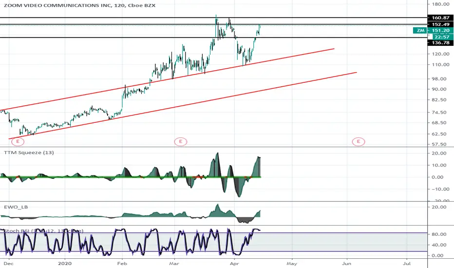 Really both red lines will happen eventually. I think this is WAY OVERVALUED at $150. I actually can see zoom being dumped after the virus it doesn't even come close to stacking up to other platforms. Might even break the bottom trend eventually. All big corps are against it. Either way the buy back in zones are absolutely obvious.