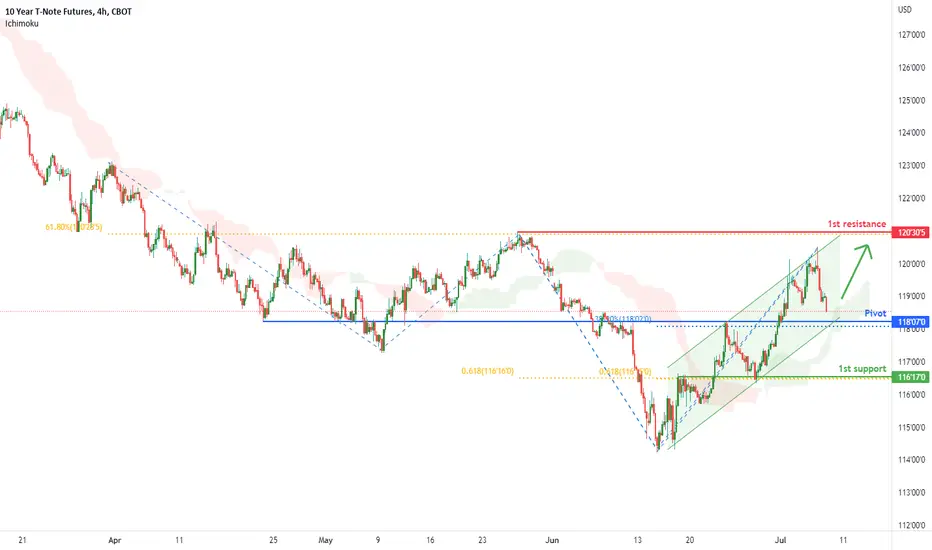 Preferred Case: On the H4, with price moving in an ascending trend channel and moving above the ichimoku cloud , we have a bullish bias that price will bounce off the pivot at 118'07'0 in line with the overlap support and 38.2% fibonacci retracement to the 1st resistance at 120'30'5 at the swing high.