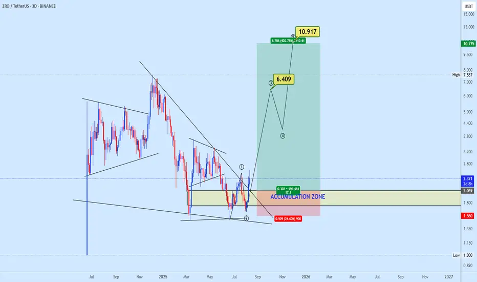 ZROUSDT has broken out from a falling wedge pattern, signaling a potential bullish reversal. The accumulation zone offers an attractive area for initiating long positions, with price structure and breakout momentum aligning to favor upside continuation. Monitoring volume confirmation and key resistance reactions will be critical for validating further bullish follow-through.