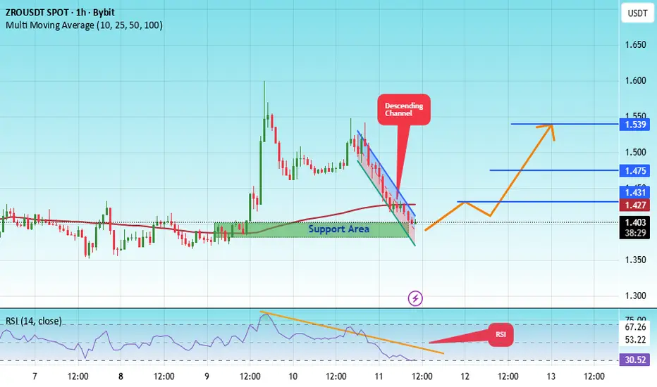 The price is moving in a descending channel on the 1-hour timeframe. It has reached the lower boundary and is heading towards breaking above it, with a retest of the upper boundary expected.