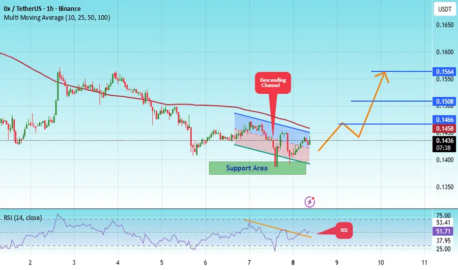 There is a key support zone in green at 0.1380. The price has bounced from this level multiple times and is expected to bounce again.