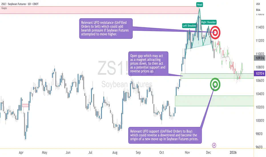 Traders using standardized futures contracts must structure their decisions around contract size, tick value, and margin requirements. The chart example in this idea uses the standard ZS contract, which represents 5,000 bushels. The micro contract (MZS) represents 500 bushels. This difference directly affects position sizing and the dollar impact of each tick. Because margin requirements vary over time, traders should always check the latest values before entering any position.