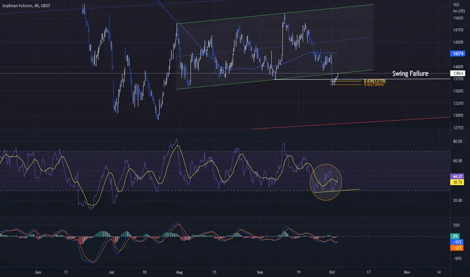 Soybeans is looking decent with a nice bounce off of the GP and a technical swing failure of the local lows. The price must close above the parallel channel for me to hold this long.