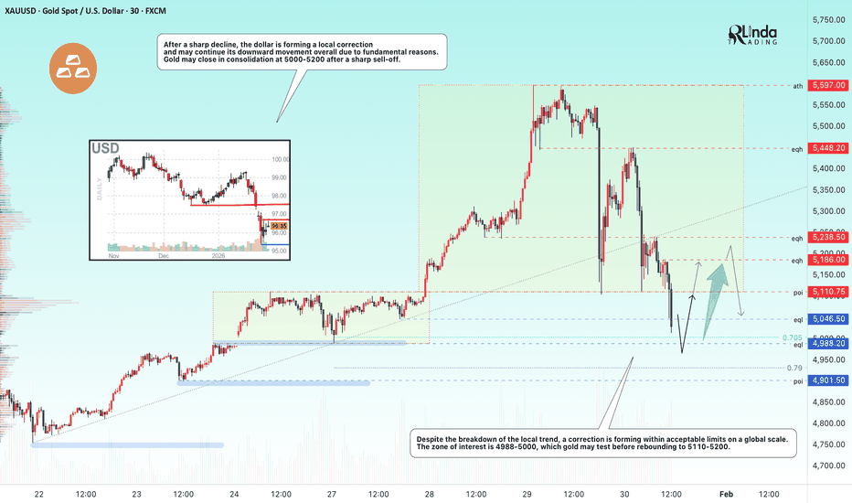 Despite the breakdown of the local trend, a correction is forming within acceptable limits on a global scale. The zone of interest is 4988-5000, which gold may test before rebounding to 5110-5200. Gold may close in consolidation at 5000-5250 after a strong liquidation. It is important to monitor the market's reaction to key levels!