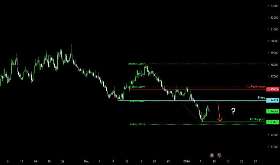 Heading towards 38.2% Fib resistance?EUR/AUD is rising towards the pivot, which has been identified as a pullback resistance that aligns with the 38.2% Fibonacci retracement and could drop to the 1st support.