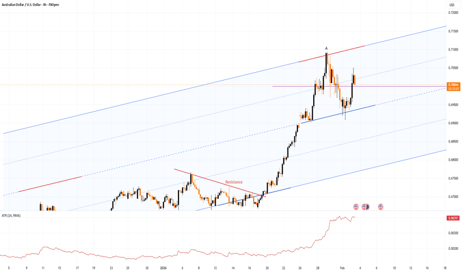 Since the end of last month, AUD/USD has been trading within an ascending channel (shown in blue).