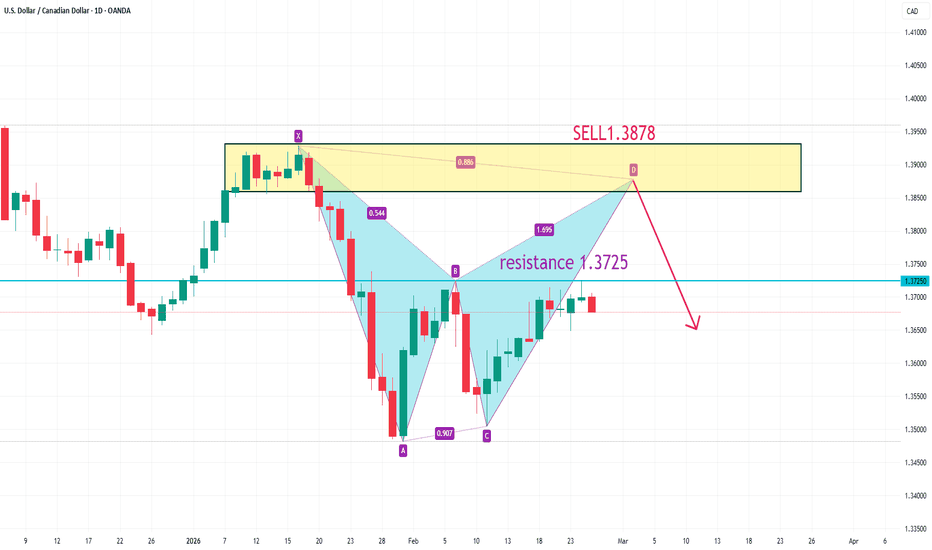 USDCAD SELL 1.3878On the daily chart, USD/CAD has stabilized at lower levels. Currently, attention should be paid to the resistance around 1.3725; a break above this level could lead to further upward movement, with a target around 1.3878. When the price reaches 1.3878, watch for a potential bearish bat pattern, as this level falls within a previous supply zone.