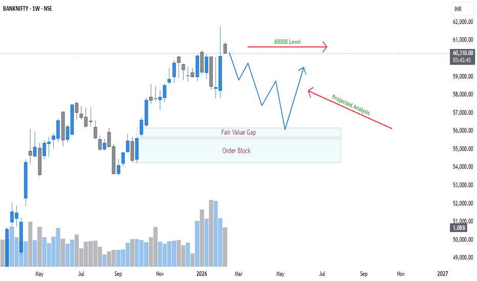 Bank Nifty Projected Move - Analysis as per Market StructureBank Nifty is currently trading around 60,740 (as of Feb 13, 2026 close vicinity), near the key psychological 60,000 support amid mild bearish cues. Here's an enhanced market structure analysis incorporating your view.