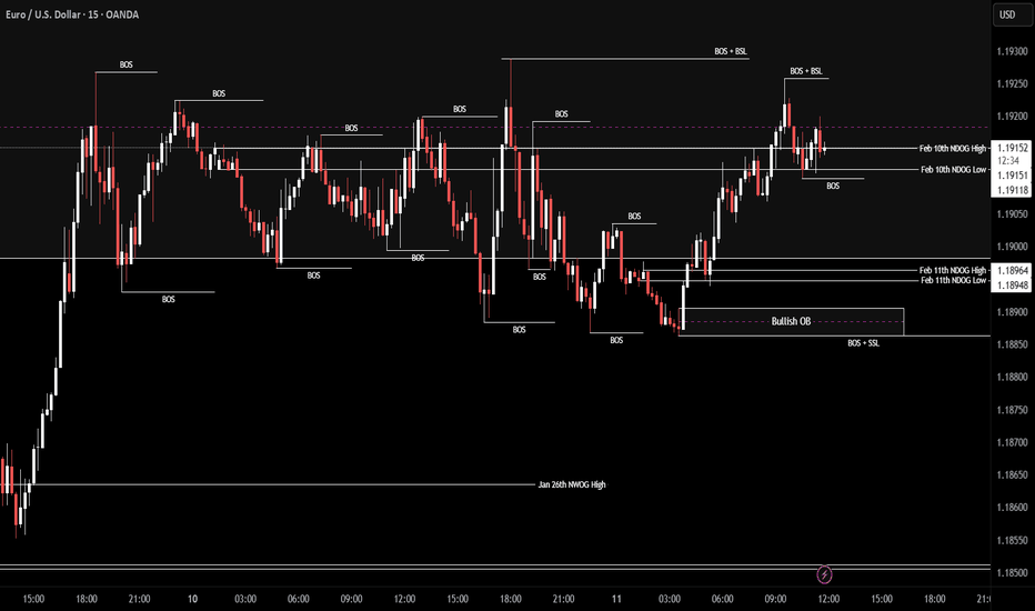 EUR/USD | Consolidation over? (READ THE CAPTION)By analyzing the 15m chart of EURUSD we can see that it has been consolidating in the same range in the past 2 days, Currently being traded at 1.1915, barely above the NDOG High. If EURUSD manages to hold itself above the NDOG, the targets are: 1.1922, 1.1929, 1.1936 and 1.1943.
