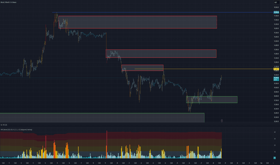 Although a reaction was observed from this area, the current volume distribution suggests continued downside potential, with a likely retest of the key technical level at $90,160.