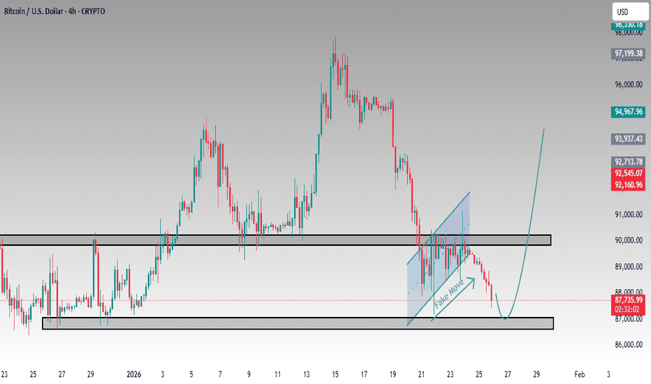 BTC/USD BUY SIGNAL – Support + Fake out Reversal Setup On the 4h Bitcoin chart, price has wicked down sharply into the major support zone around 87,000 – 87,866, forming what appears to be a classic fake move / liquidity grab below the channel bottom (blue shaded area + dashed trendline). This is often a bullish trap before reversal. Key Bullish Points: Strong horizontal support defended multiple times (gray box ~87k–91k)