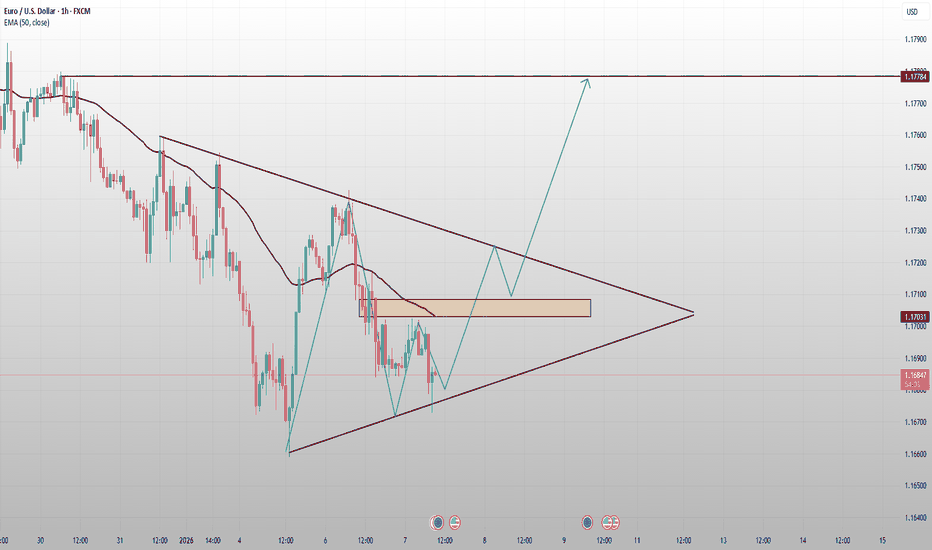 EURUSD Compressing Into a Triangle — Volatility ExpansionEURUSD on H1 is currently trading within a symmetrical triangle, reflecting a clear contraction phase after the prior bearish move. The market is no longer trending impulsively; instead, price is compressing between descending resistance and ascending support, signaling indecision and energy build-up.