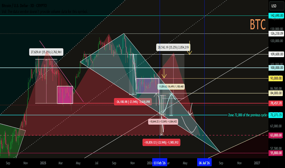 BTC Secondary Trend "Price Zone 100". Reversal Zones. 02 2026Logarithm. 3-day time frame. “Psychology 100” zone (1 distribution zone, only +372% of the average price of the 20,000 zone set).