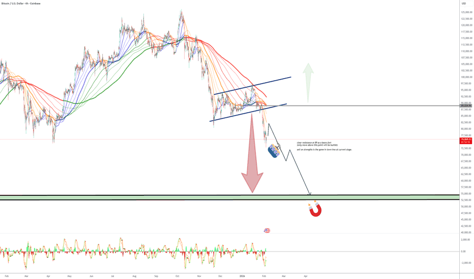 As long as BTC remains inside this descending channel, every rally should be treated as a selling opportunity, not a breakout. A real trend shift requires acceptance above channel resistance until then, downside continuation remains the dominant scenario.