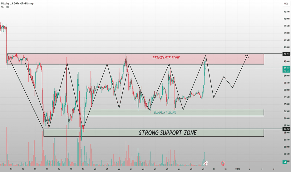 Breakout Ahead or Another Trap Inside the $85K–$90K Range?Bitcoin is currently trading inside a well-defined consolidation range between $85,000 and $90,000, and the latest price action confirms that this zone remains highly respected by both buyers and sellers. On the 1H timeframe, price was aggressively pushed into the upper boundary near $89,500–$90,000, but the immediate rejection shows that sell-side liquidity and profit-taking are still concentrated at this resistance zone. This behavior is typical of a mature range market, where impulsive moves toward the extremes are often faded unless strong follow-through volume appears.