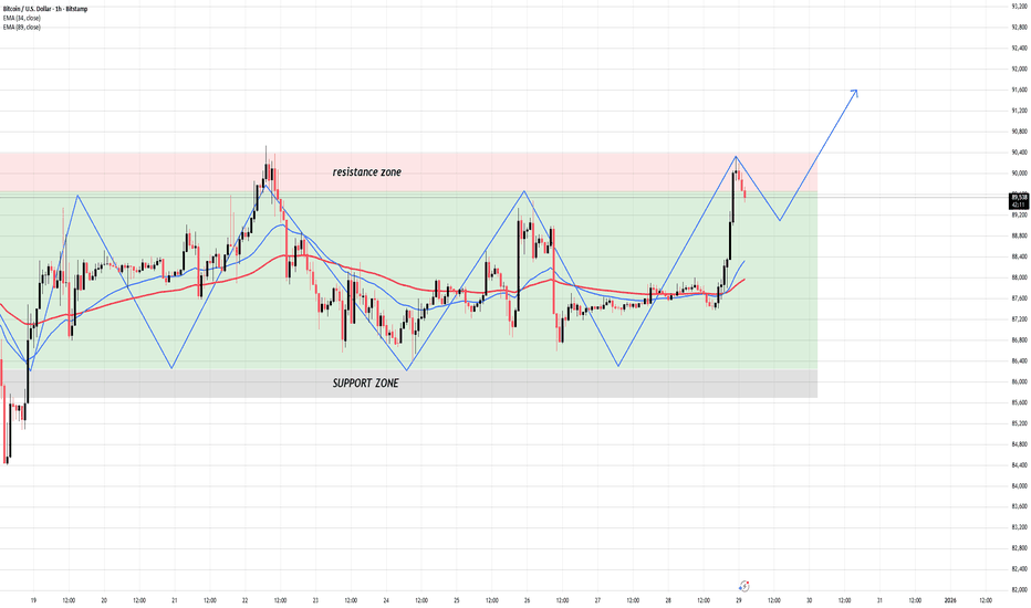 Bitcoin is still trading inside a well-defined range, not a trending market. Price continues to oscillate between the support zone around 86,000–86,500 and the resistance zone near 89,800–90,500, confirming that the market is in consolidation rather than expansion. Despite recent impulsive candles, structure remains intact and controlled.