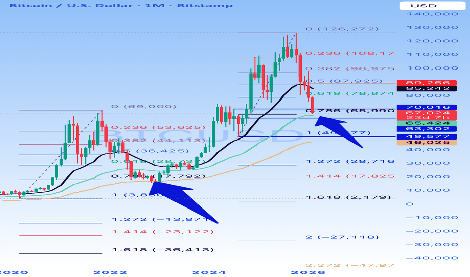 • Current price (~67k) is again pulling back from a major high (~126k) and is now approaching the same 0.786 Fib zone (~65–66k), which you highlighted.