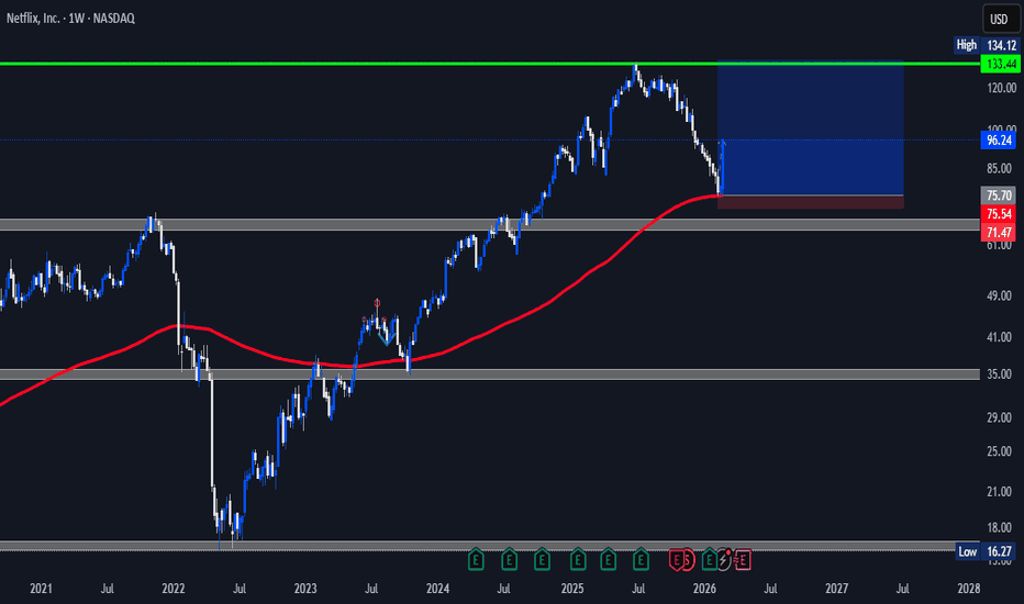 $NFLX 80% move incoming?After tapping the 200 EMA, NFLX showed no signs of panic selling, instead, price stabilized and began printing higher lows, suggesting absorption rather than distribution. This zone acted as a liquidity pocket where weak hands likely exited and stronger participants accumulated positions. The recent compression beneath resistance signals building pressure, and a decisive daily close above the range high could trigger a momentum expansion phase fueled by short covering and trend-following flows. I’m not blindly predicting an 80% move, but structurally this is how larger upside legs begin, reclaim trend, build cause, then expand. Invalidation remains a sustained close back below the 200 EMA, which would shift the narrative back to distribution. Until then, this looks like early-stage positioning rather than late-stage chasing.