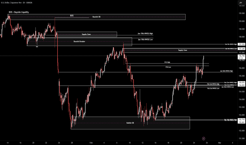 USD/JPY | Retest! (READ THE CAPTION)By analyzing the 2H chart of USDJPY we can see that after reaching 157.97 yesterday, just 2 pips short of supply zone, it dropped out of the Bearish Breaker zone again and went below the Feb 9th NWOG Low, before going back up above it to the Bearish Breaker, but it dropped yet again and is now being traded at 157.43, inside the NWOG zone.