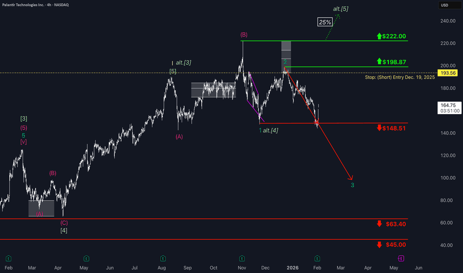 PALANTIR: Bounce From Key Support LevelPLTR shares continued their decline, reaching support at $148.51 yesterday. For the turquoise wave 3 to complete, this level needs to be decisively breached. However, there remains a risk that the green five-wave sequence is not yet finished, which could see the price move above the $222.00 resistance level (probability: 25%). Such a move would trigger the stop-out of our short position, which was opened on December 19, 2025, at breakeven—our stop was adjusted when the corresponding Target Zone was deactivated to avoid potential losses. Looking further ahead, even lower price levels are likely: the beige wave II is expected to bottom within the second green Target Zone, between $72.58 and $40.66.