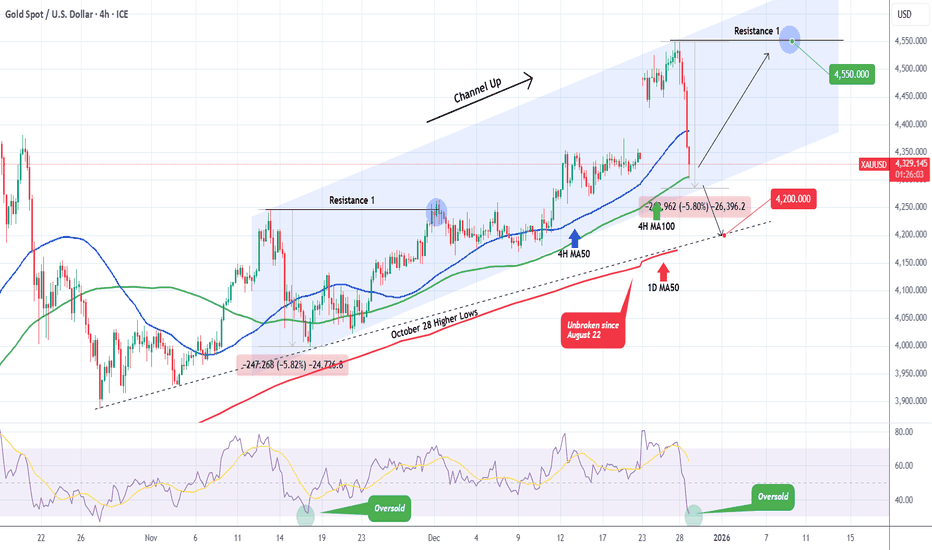 If however Gold closes below the bottom of the Channel Up, expect a quick test of the 1D MA50 (red trend-line), which is unbroken for 4 months (since August 22) and is where the October 28 Higher Lows is also, at 4200. The price is currently close enough to the bottom of the pattern, allowing for a solid low risk tight SL strategy.