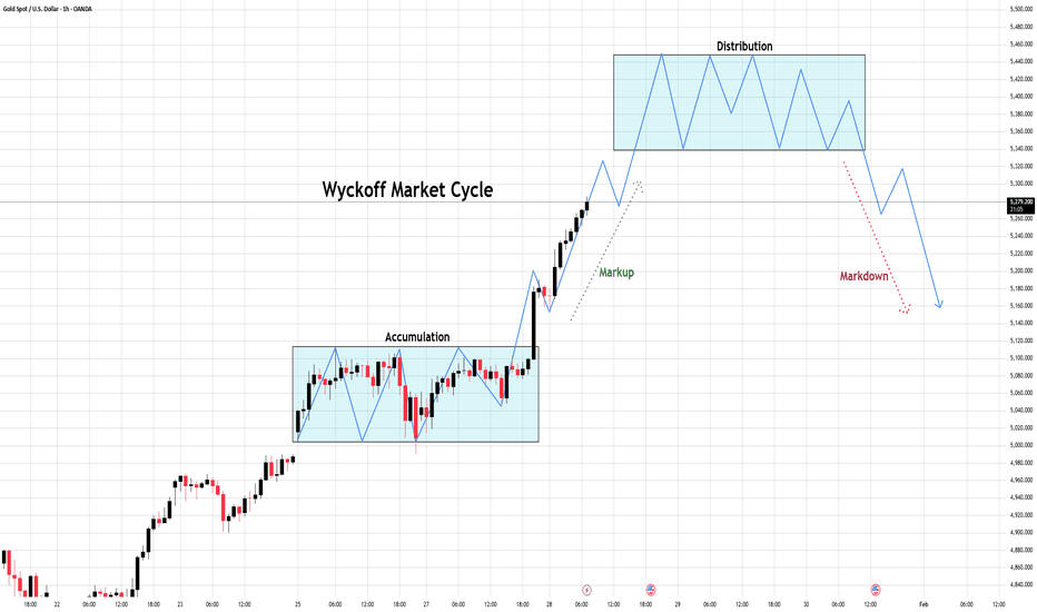 Gold has just completed a textbook Wyckoff cycle into a new all-time high, and the structure now suggests the market is transitioning from Markup into Distribution, not continuation. The impulsive rally from the demand zone / gap around 5,000 was clean and aggressive, confirming strong institutional accumulation. Price then performed a clear Jump Across the Creek (JAC), followed by a successful test, validating the breakout and triggering the final markup phase.