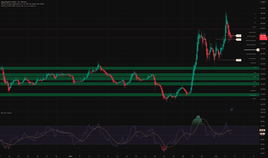 On the 4H chart we’ve got a classic post-pump chill phase: sharp vertical move, then a sideways pullback between roughly 31 and 35 that looks like a bull flag. Volume on the run-up was heavy and is now fading while RSI cooled from overbought back to the 50–60 zone - a healthy reset instead of a trend break. I’m leaning long, expecting liquidity grabs toward 32-31 and then a push through 34 with eyes on 36-38.