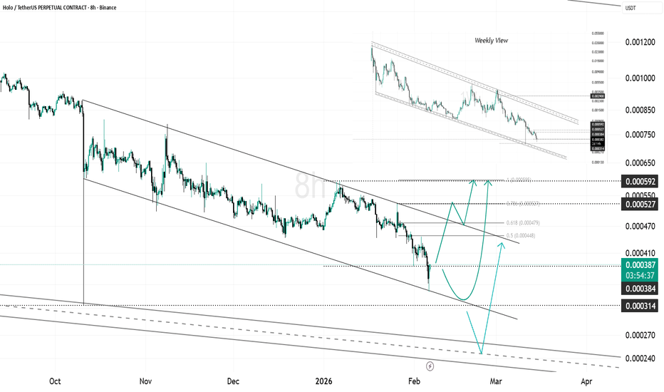 HOT Near Lower Channel Support, Liquidity Zone in FocusHOT continues to trade inside a clear descending channel on the higher time frame and is currently positioned near the lower boundary of the structure.