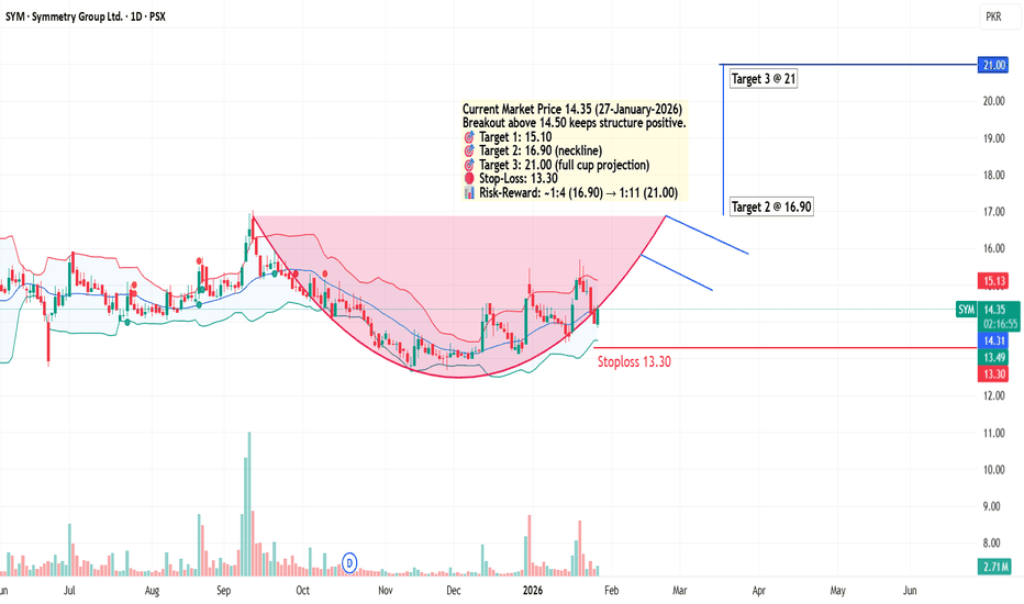 Cup and Handle formation in SYMMETRYPrice has formed a clear Cup & Handle structure, indicating accumulation followed by controlled consolidation. The pattern remains valid above 14.50, with resistance levels at 15.10, 16.90 (neckline), and 21.00 based on classical cup projection.