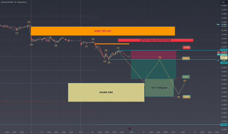 DAX Short set-up in M15!Following a strong bullish move, the DAX shows short-term weakness on the M15 chart. Price is trading below a key intraday support zone, which may indicate a potential short scenario. A pullback toward the former support area around 24,240–24,250 can be observed as a possible reaction zone. If this area acts as resistance, a continuation toward the next support near 24,170 comes into focus.